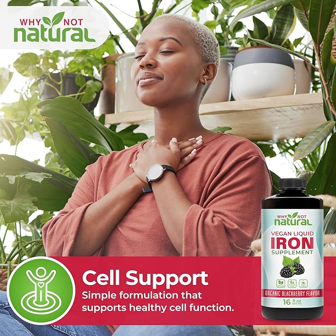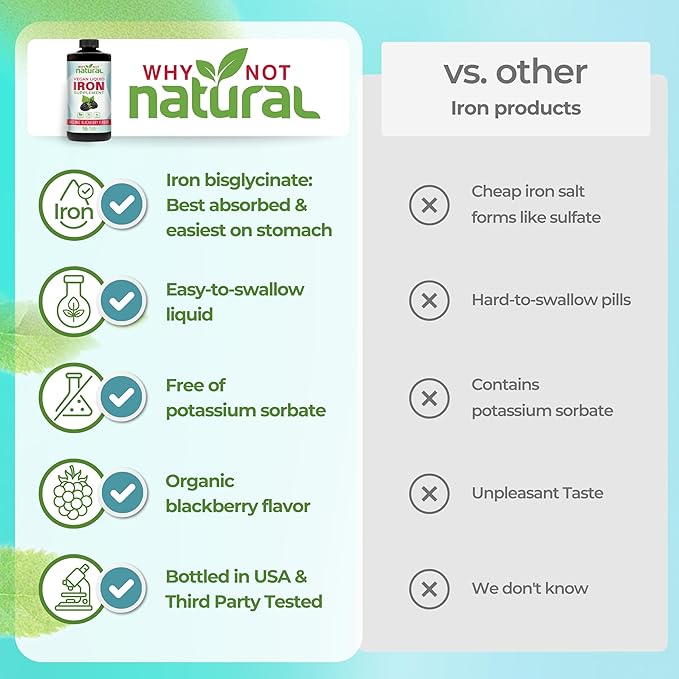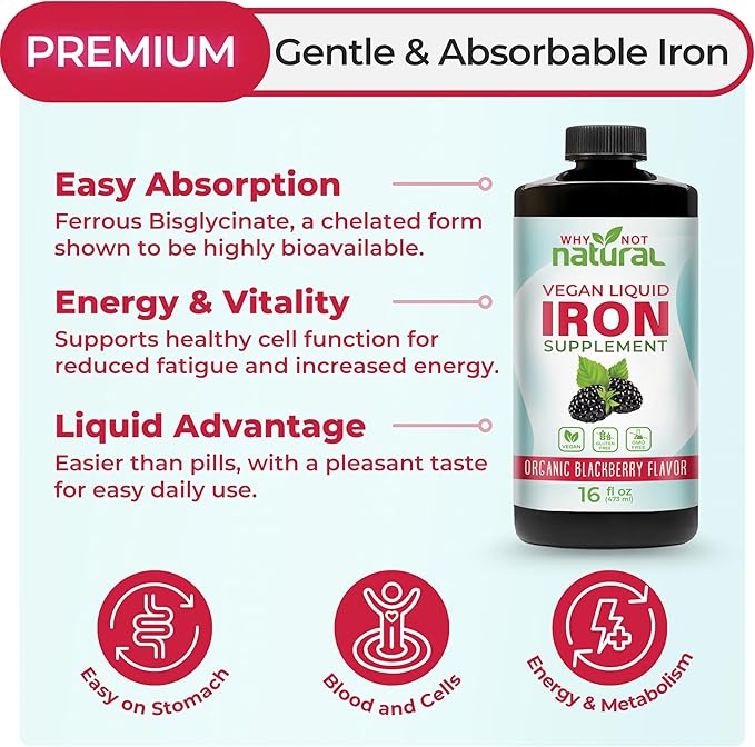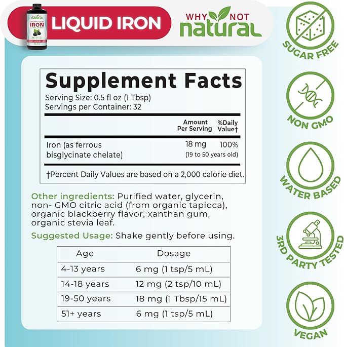Why Not Natural Liquid Iron Supplement for Women, Men and Kids, Vegan Formulation for Anemia, Sugar Free, Vegan, Non-GMO, Organic BlackBerry Flavor 16 Fl Oz