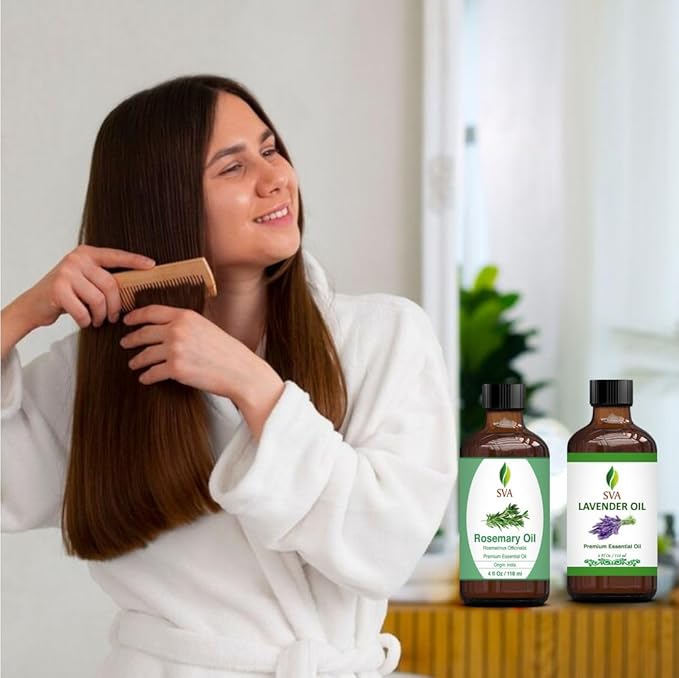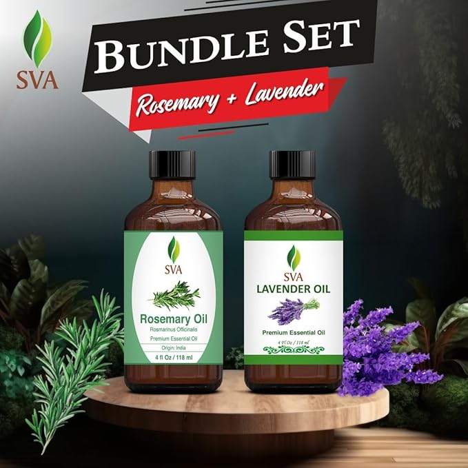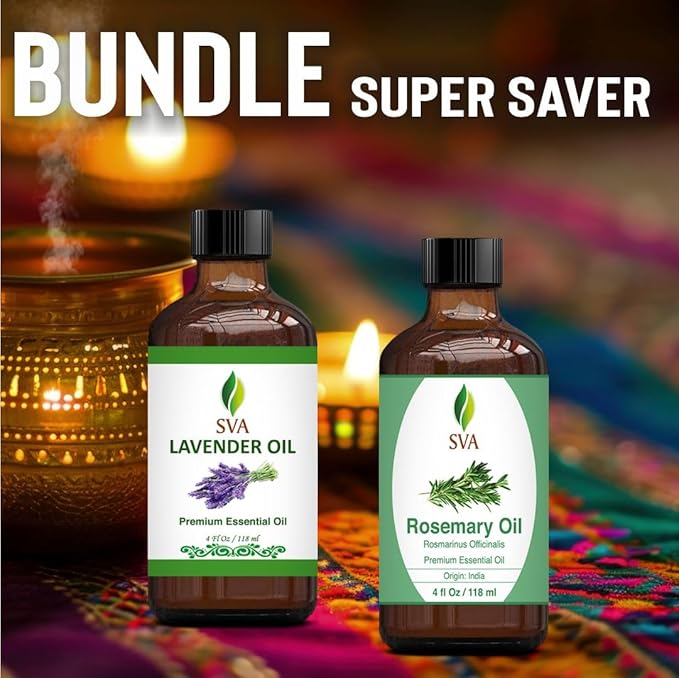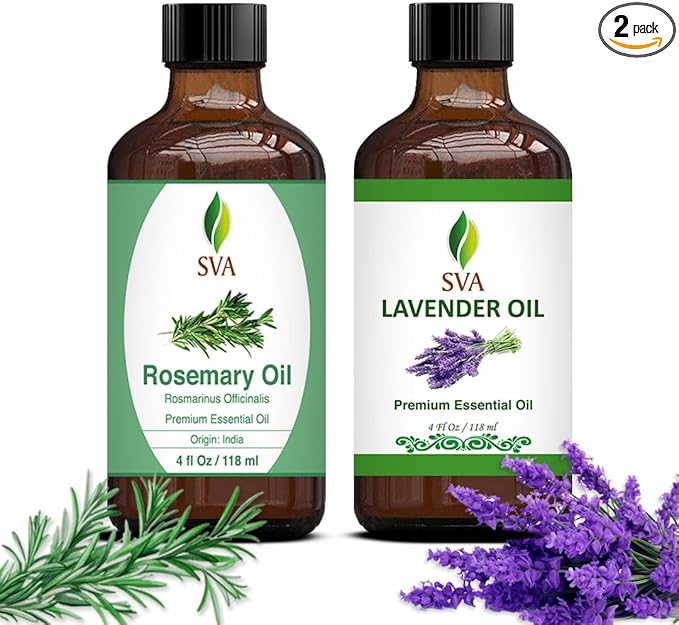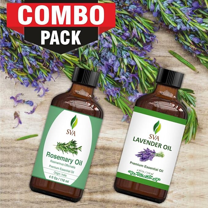 SVA Rosemary Essential Oil 4oz and Lavender Essential Oil 4oz Bundle Super Saver Combo – Premium Grade Value Set for Hair Oiling, Scalp Massage, Hair Care, Skin Care, Body Massage and Aromatherapy