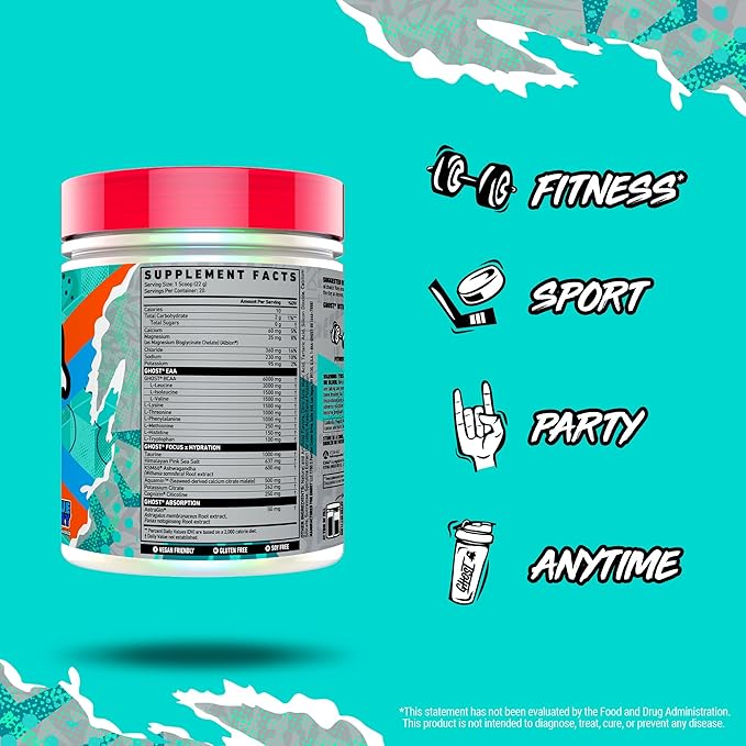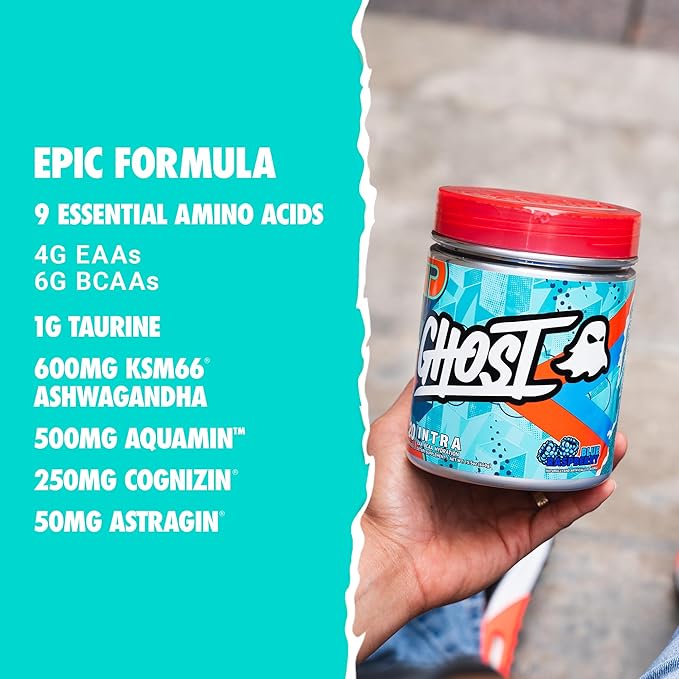 - Sustain Greatness at Any Hour*: GHOST Intra combines EAAs, BCAAs, nootropics, and hydration to fuel your body in and out of the gym. Stack it with pretty much anything (like GHOST Size) or use it by itself. Blue Raspberry flavor. 20 servings per container.