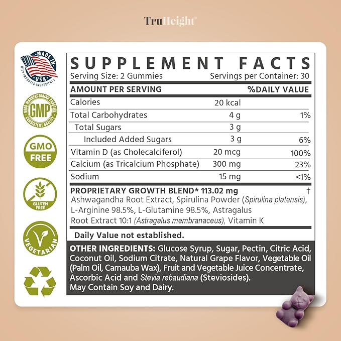 - TRUHEIGHT GROWTH GUMMIES FOR KIDS & TEENS: TruHeight's growth gummies contain a responsibly sourced collection of vitamins and minerals, including Ashwagandha, Calcium, Vitamin D, and Vitamin K, culminating in natural growth and development.* TruHeight is the #1 Pediatrician Recommended Brand for Growth & Development. *IQVIA ProVoice Survey, March 2025.