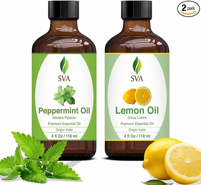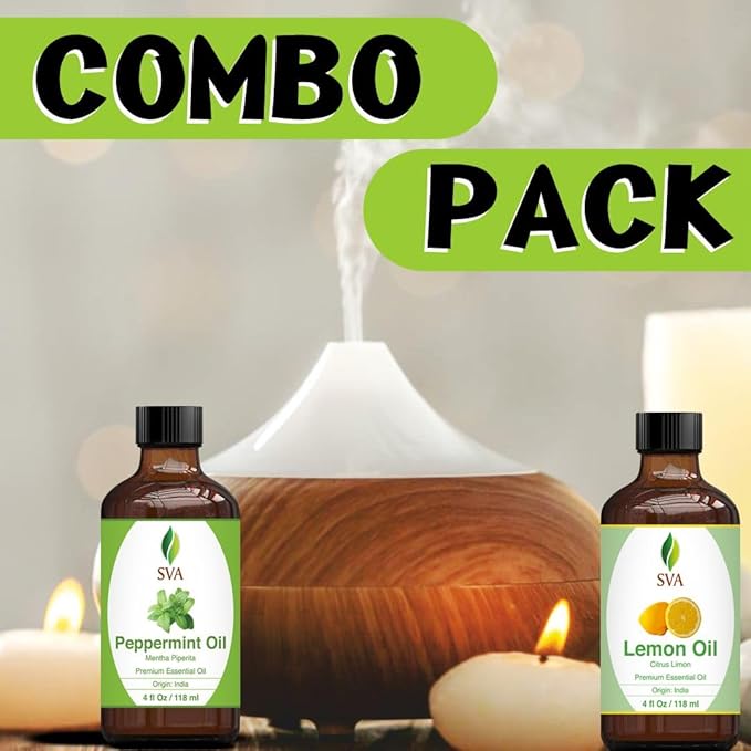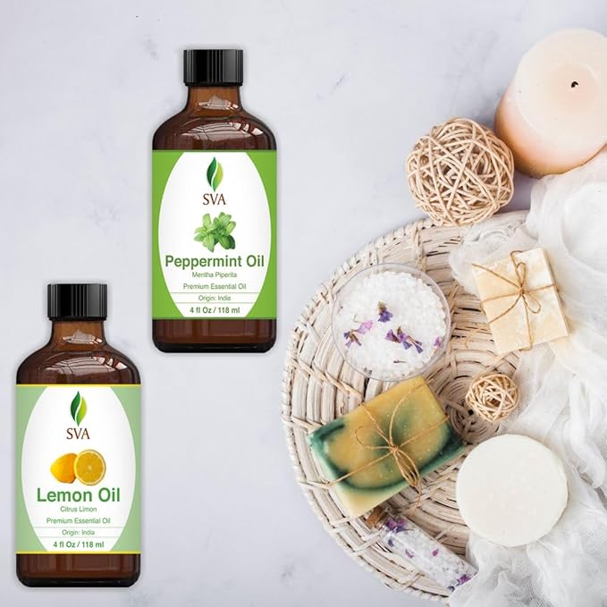 - Premium Grade Oil Pack: SVA Peppermint oil is steam distilled from Mentha Piperita herbs. SVA Lemon oil is cold-pressed from Citrus Limon fruit peel. Our value oil kit is free of preservatives and not tested on animals. We care for you