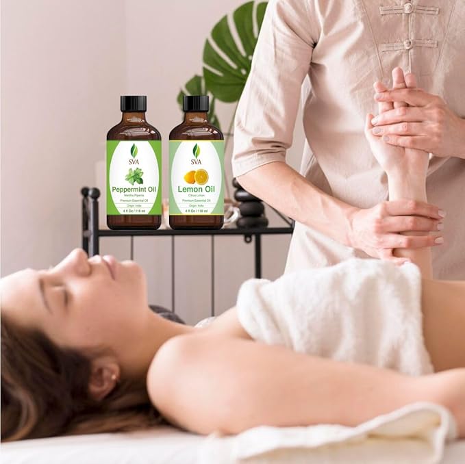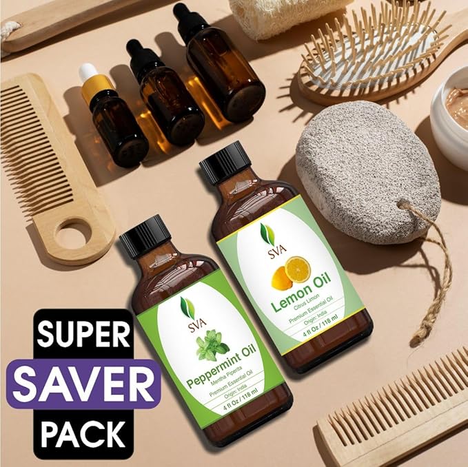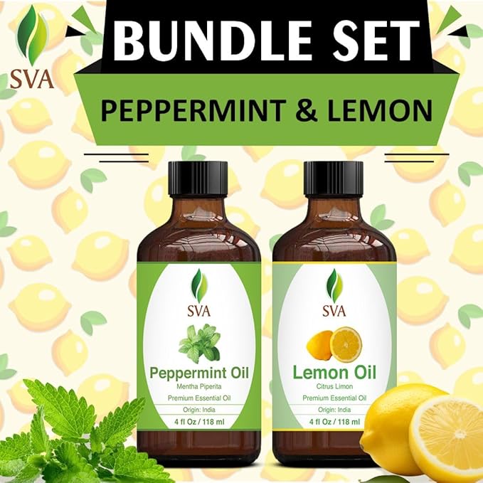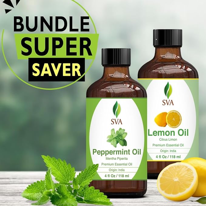 SVA Peppermint Essential Oil and Lemon Essential Oil 4oz Bundle Super Saver Combo – Premium Grade Value Set for Aromatherapy, Scalp Massage, Hair Care, Skin & Body