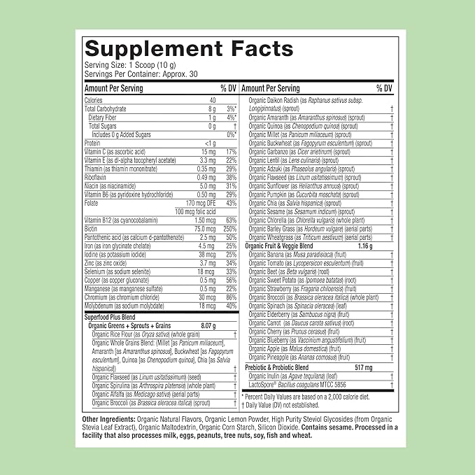 - Support Your Lifestyle Without Compromise: Nourish your body with the power of 39 superfoods and probiotics – all in one clean, convenient scoop. This nutrient-packed powder is easy-to-digest, making it effortless to fuel your body.