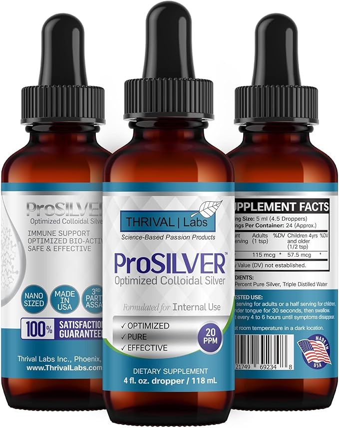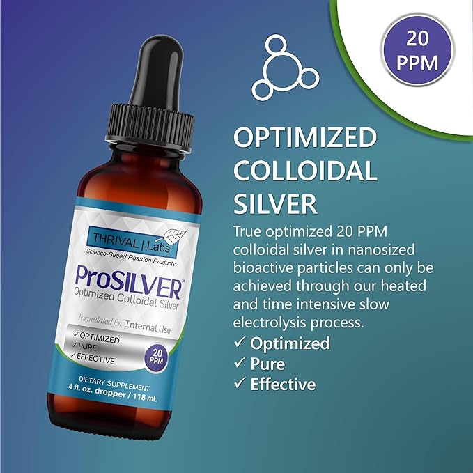 ProSILVER Blue Label 20 PPM True Colloidal Silver Liquid Drops (4oz Dropper), Optimized Bio-Active Nano-Sized Liquid Silver for Immune Support, Dark Glass Bottle - Thrival Labs (Plata coloidal)
