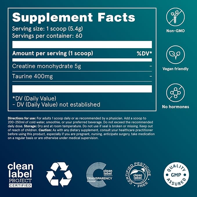 - Ingredient Story: Our Creatine+ supplement is made with creatine monohydrate, a naturally occurring compound, and taurine, an amino acid. Together, they support energy levels during exercise and recovery afterwards. It’s gluten-free, soy-free, non-GMO, and pesticide-free.