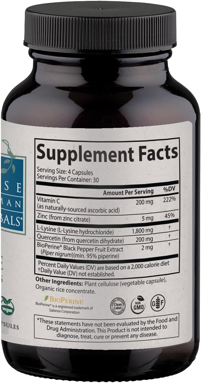 - INGREDIENTS - Vitamin C (from naturally-sourced ascorbic acid), Zinc (from zinc citrate), L-Lysine (from L-Lysine Hydrochloride), Quercetin (from Quercetin dihydrate), BioPerine (from Black Pepper Fruit Extract), Vegetable Capsule (plant cellulose), Organic Rice Concentrate