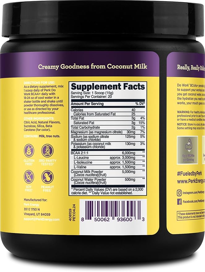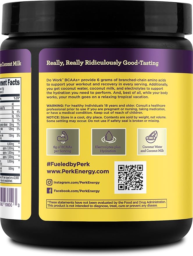 - Perk BCAA's Includes Hydration Electrolytes with Coconut Water and Coconut Milk