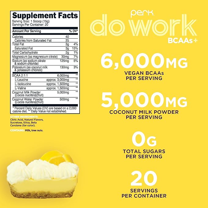 Perk BCAAs + Hydration Electrolytes Powder (Lemon Tart Flavored, 20 Servings) - with Coconut Water and Coconut Milk