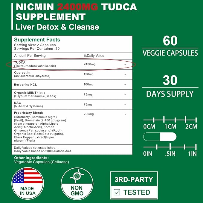 - 2400MG Tudca Supplement: NICMIN 2400mg Tudca supplement is an ultra-strength bile salt that supports liver function by breaking down toxins and waste build-up in the liver and kidneys.