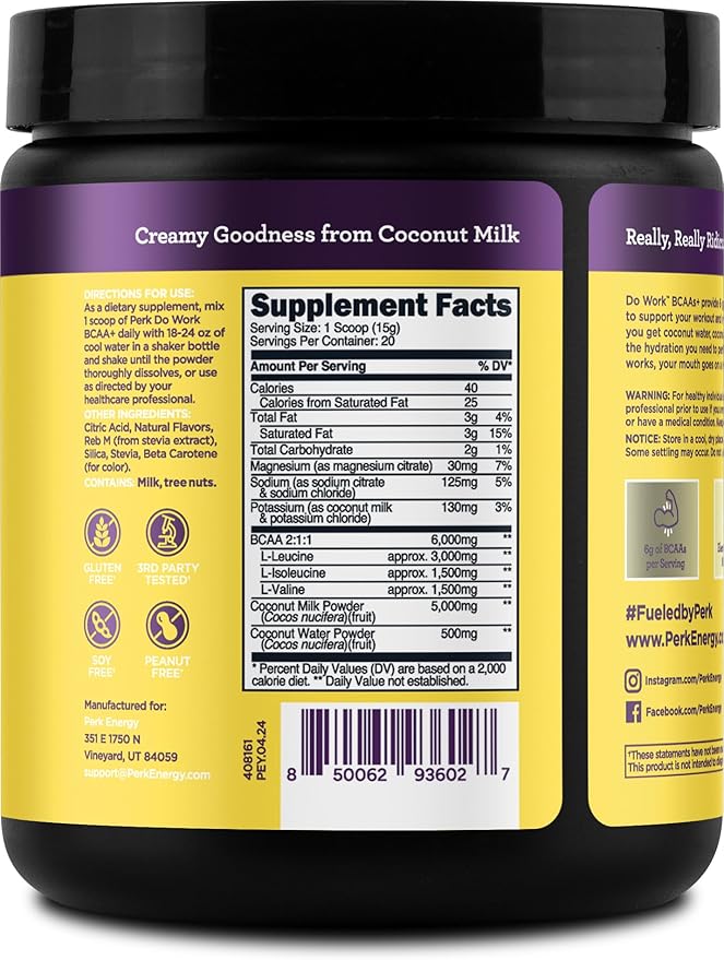 - GLUTEN, SOY, & PEANUT FREE: Perk Do Work BCAAs+ is formulated to be gluten-free, soy-free, and peanut-free, providing peace of mind for those with dietary sensitivities or restrictions.