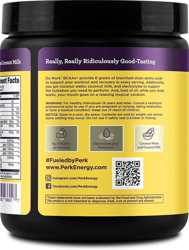 - VALUE-PACKED: Each container of Perk Do Work BCAAs+ provides 20 servings, each delivering a potent dose of 6g of BCAAs, ensuring you get ample support for your workout and recovery needs.