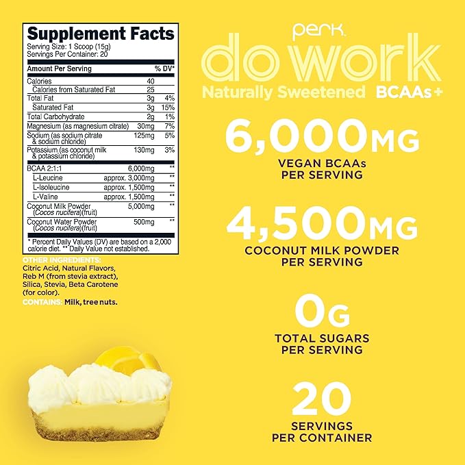 Perk Do Work BCAAs + Hydration Electrolytes Powder (Naturally Sweetened Lemon Tart Flavored, 20 Servings) - with Coconut Water & Coconut Milk