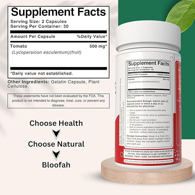 - Pure Tomato Powder: Each capsule contains 500mg of pure tomato powder, providing lycopene for health support.