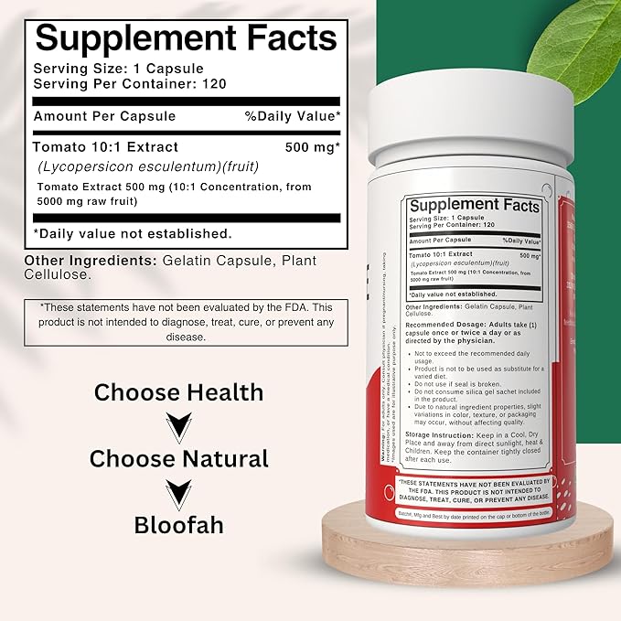 - 【Premium Tomato Fruit Extract (Solanum lycopersicum) 10:1】– Each capsule contains 500mg of highly concentrated 10:1 extract powder sourced from ripe tomato fruit, ensuring a rich composition of naturally occurring compounds.