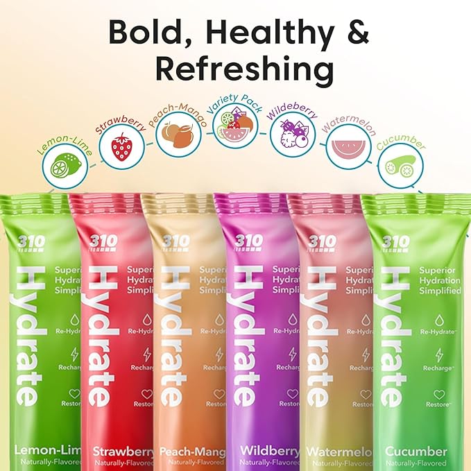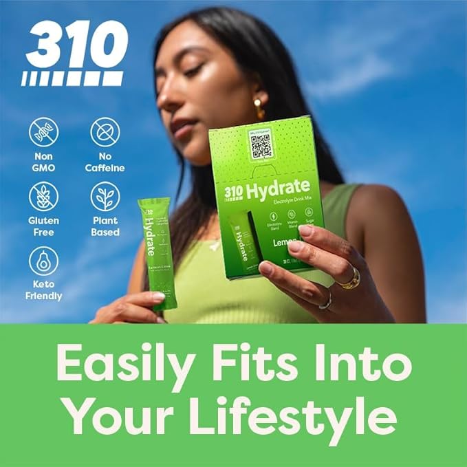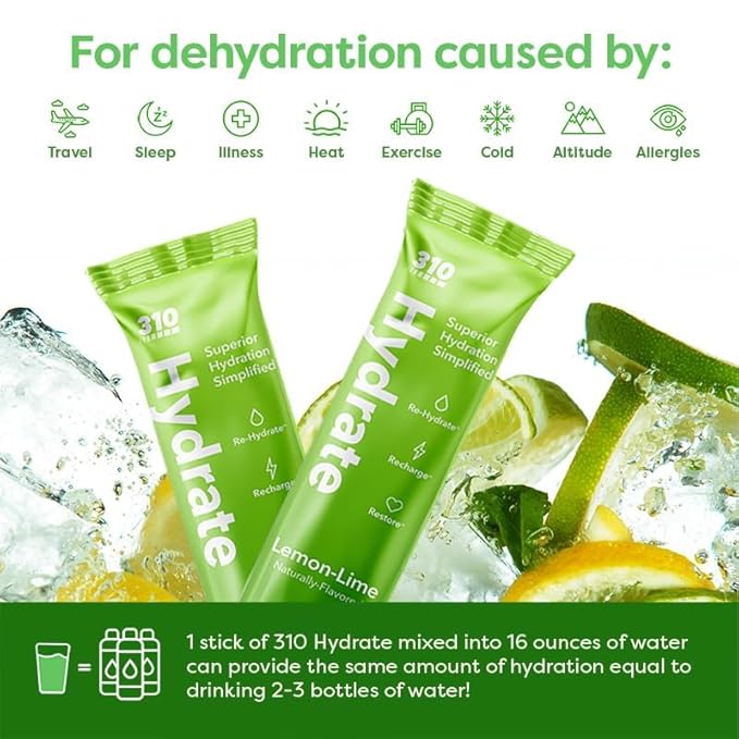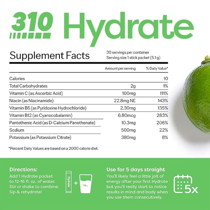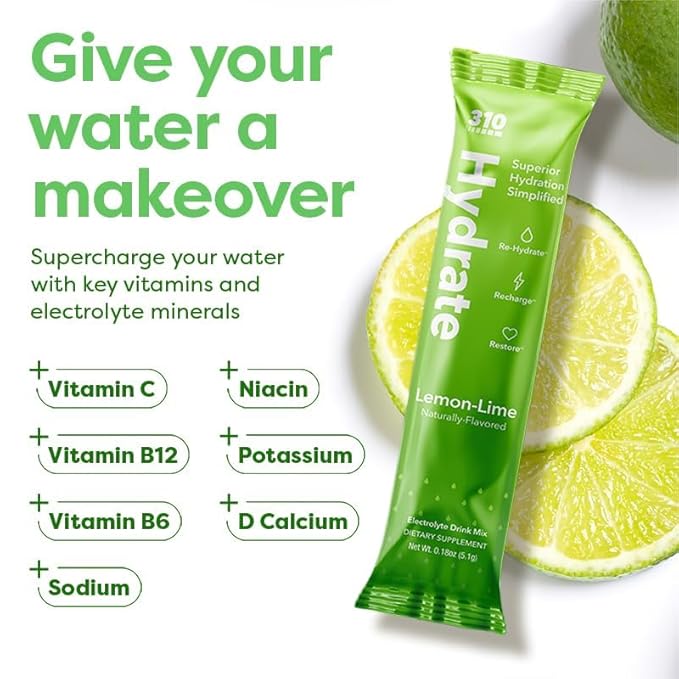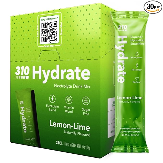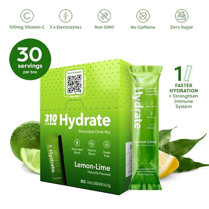 310 Hydrate Electrolyte Powder Packets – Key Vitamins & Minerals – No Sugar – Keto Friendly Hydration Drink – 30 Single Servings, Lemon Lime Flavor
