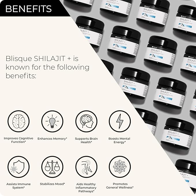 - PROMOTE OVERALL WELL-BEING: Blisque SHILAJIT + is a comprehensive supplement that enhances your well-being. It will support your immune system, improve heart health, act as a brain booster, supercharge you with energy, stabilize your mood, and aid a healthy inflammatory response.*