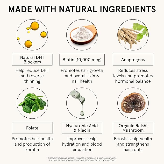 - Natural DHT Blockers: Formulated with a unique blend of natural DHT blocker supplement, DHT is a hormone linked to hair loss. Ingredients like saw palmetto and nettle root extract play a significant role in reduce hair thinning by blocking DHT and promotes the regrowth of stronger, thicker hair