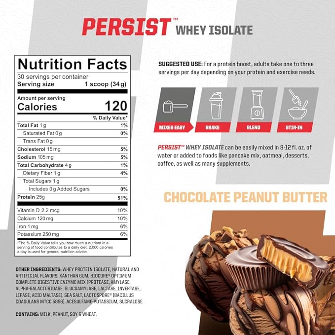- LEANER MUSCLE, WITHOUT THE CALORIE BLOAT: Each serving of PERSIST provides a solid 24g of protein at just 120 calories per serving with zero added sugar, or fat so you can easily bump up your daily protein intake, without excess calories that can mess up your macros