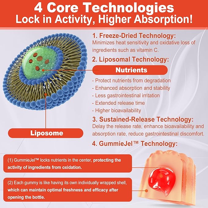 - 【Protect Activity, Higher Absorption! 】Methylation technology achieves optimal absorption of B complex. GummieJel technology fills the ingredients in the center of the gummy, encapsulating and protecting it from air and high temperature. Together, they improve the stability, absorption rate and bioavailability of nutrients.