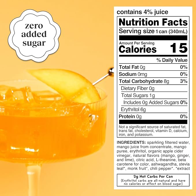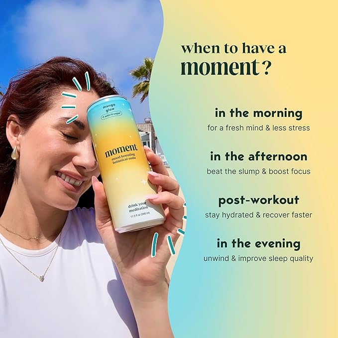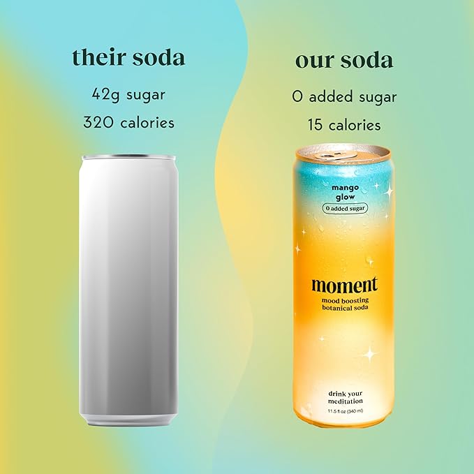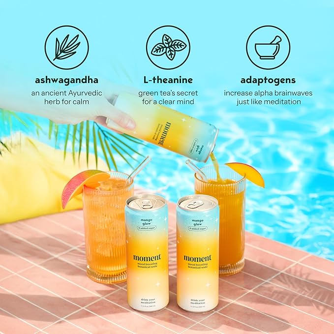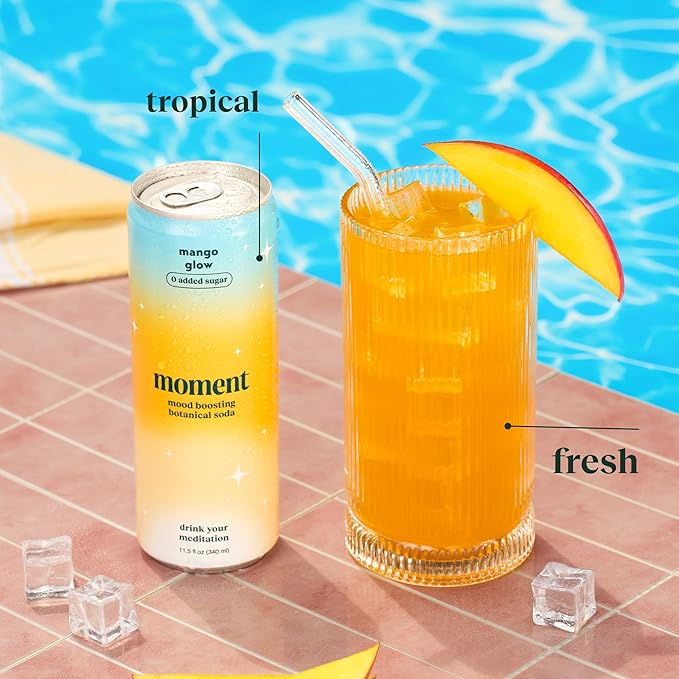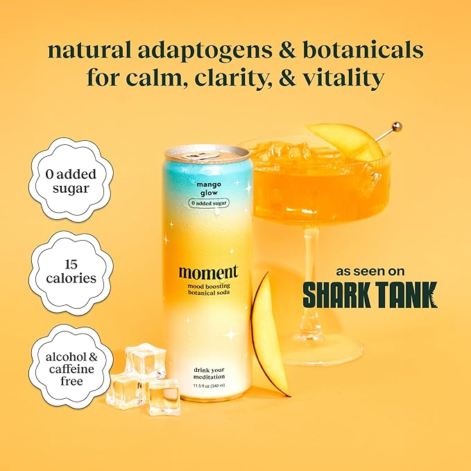 Moment Botanical Soda Soft Drink (Shark Tank) - SPARKLING Drinks | Mango Glow | L-Theanine & Ashwagandha for Calm & Clarity | 0 Added Sugar 0 Caffeine | 12-pack