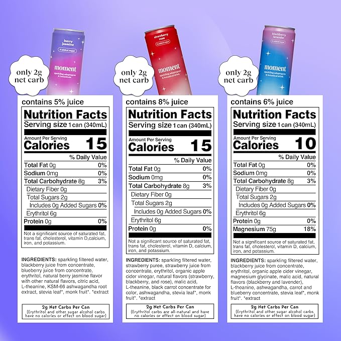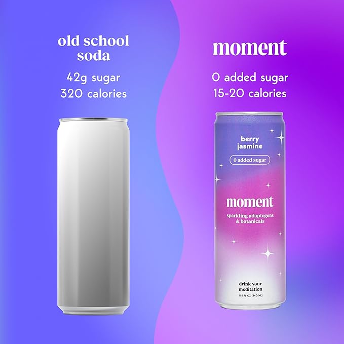 - DITCH THE SUGAR & ENJOY GOOD-FOR-YOU INGREDIENTS: Moment adaptogen drink has zero added sugar, zero caffeine, and only between 15 and 20 calories per can. It’s made with real fruits and immunity-boosting botanicals like antioxidant-packed hibiscus and fresh summer mint to support gut health and improve overall wellness.
