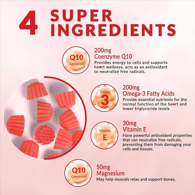 - COQ10 for He❤rt Support: Our coenzyme q10 supplement is an natural vitamin of antioxidants to help promote He❤rt and cardiovascular well-being. Our CoQ10 gummies are combined with 200mg of Omega-3 fatty acids(EPA & DHA)that provide essential nutrients for the normal function of the He❤rt and lower triglyceride levels.