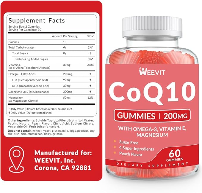 - Chewable CoQ10 Gummies for Adults: CoQ10 Gummies are a delicious alternative to pills. Provides 200mg of CoQ10 per serving in peach-flavored gummy. Coenzyme Q10 is found in every cell of the body and is essential to the making of cellular energy (ATP).