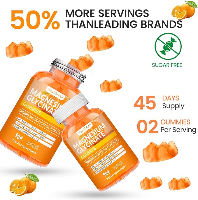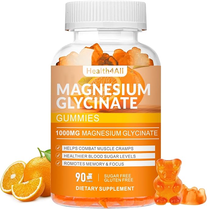 Magnesium Glycinate Gummies 1000mg, High Absorption Sugar Free Magnesium Potassium Supplement for Relaxation, Stress Relief, and Sleep Support for Adults & Kids - 90 Orange Gummies