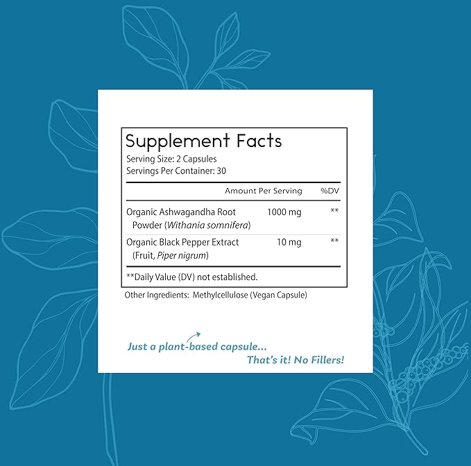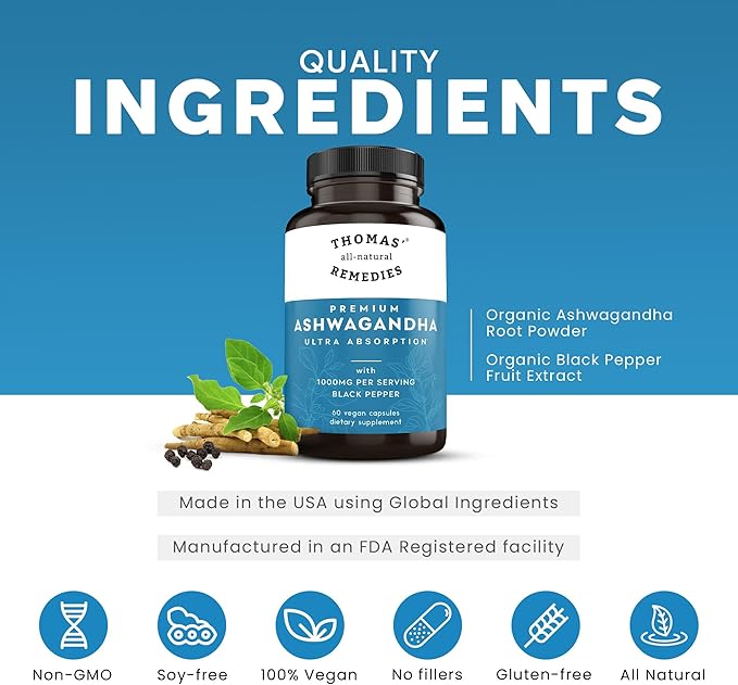 Thomas' all-natural Remedies Organic Ashwagandha Stress Support Supplement, Mood & Energy Support, Pure Ashwagandha 1000mg, Ultra Absorption with Black Pepper, Vegan, No fillers