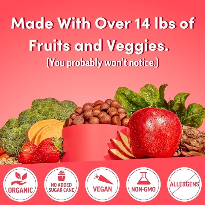 - VITAMINS FROM WHOLE FOODS: Our real fruit gummies feature 13 natural vitamins and phytonutrients from 14 lbs of organic fruit and vegetables, for better absorption. Included are key vitamins and nutrients that promote immune health, energy levels and focus such as Vitamin A as Beta Carotenes, Vitamin C, Vitamin D, Vitamin E, Vitamin K1, Vitamin B1, Vitamin B2, Vitamin B6, Vitamin B12, Niacin, Folate, Biotin, and Pantothenic Acid.