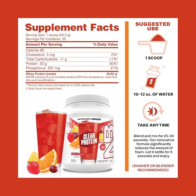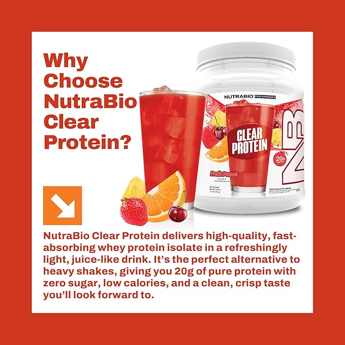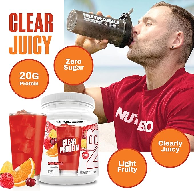 - CLEAN LIGHT & REFRESHINGLY FRUITY: Experience the clear choice with NutraBio Clear Whey Protein Isolate—a deliciously fruity, light clear protein drink that feels more like a refreshing juice than a typical thick and milky protein shake.