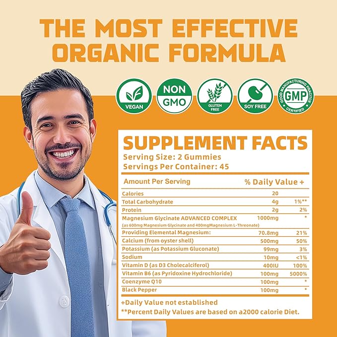 Magnesium Glycinate Gummies 1000mg with Magnesium L-Threonate,Chelated Magnesium Potassium Complex Supplement with VitD, B6, CoQ10, Calcium,Supports for Memory, Calm, Mood - 90 Gummies Orange