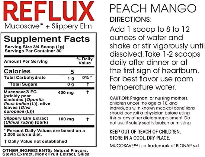 Reflux Digestive Supplement - Peach Mango Flavor - Each Tub = 30 Scoops = 30 Servings - Mucosal Support for Acid Issues - with Mucosave FG and Slippery Elm Bark (2 Tubs)