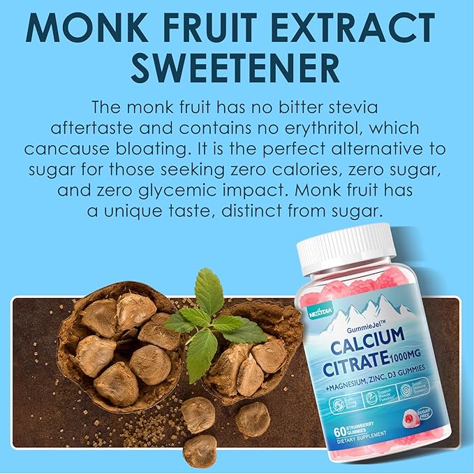 - TASTY, EASY-TO-CHEW, NATURAL INGREDIENTS: Our Calcium Magnesium Zinc Gummies are sweetened with monk fruit, a natural healthy sweetener with low calories. It is 3 to 5 times sweeter than regular sweeteners and has at least 50% fewer calories. These calcium supplement gummies come in a natural strawberry flavor.