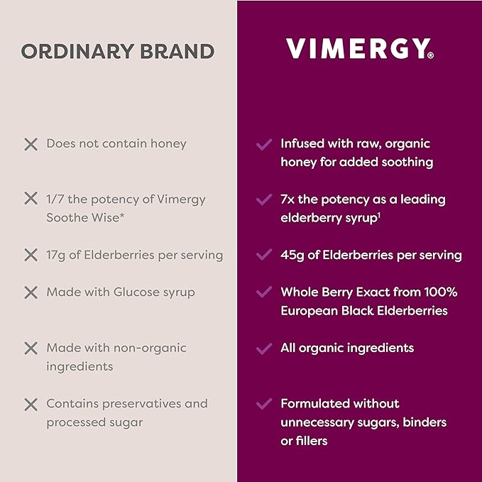 - 300 ELDERBERRIES EQUIVALENT PER SERVING.* Soothe Wise* by Vimergy provides the equivalent of 300 fresh elderberries in every adult serving and 100 elderberries in every kid’s serving.