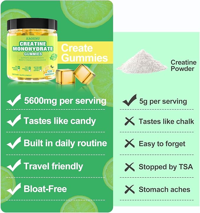 - [Creatine Monohydrate Gummies]:Creatine is one of the most effective, safe, and well-studied supplement to improve performance,increased muscle endurance,muscle growth or recovery. Just 4 gummies per serving to meet your daily 5.6g creatine requirement. Get ready to get bigger, stronger, and push beyond your limits — naturally.