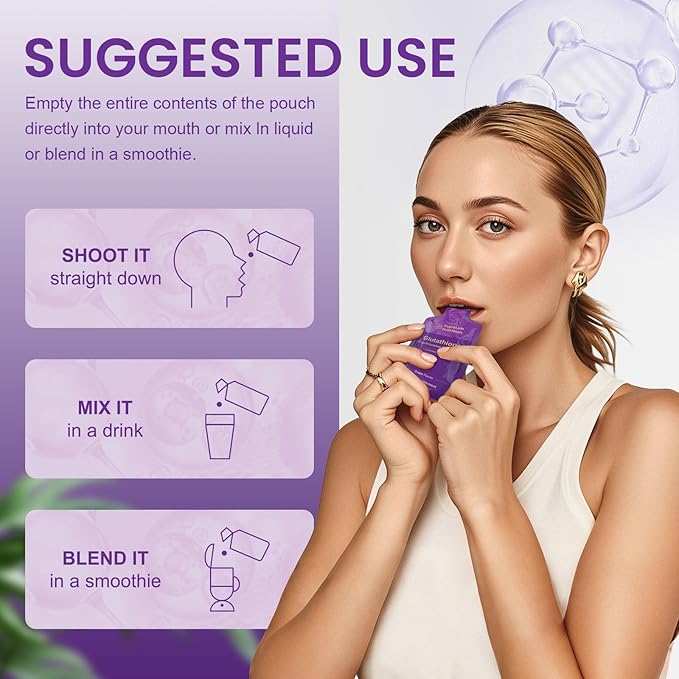 - Powerful Antioxidant Support: Glutathione, often referred to as the body’s “master antioxidant,” plays a key role in neutralizing free radicals and promoting healthy cellular function. Delivered in liposomal form, it helps support immune defense, protect against oxidative stress, and contribute to daily wellness.