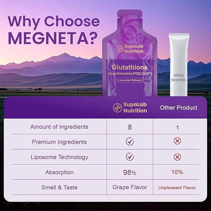 - Enhanced Absorption & Stability: Megneta Liposomal Glutathione is formulated with advanced liposomal delivery technology to help protect the integrity of active ingredients and significantly improve absorption compared to traditional capsules or powders. This innovative system supports efficient nutrient delivery while remaining gentle on the stomach.