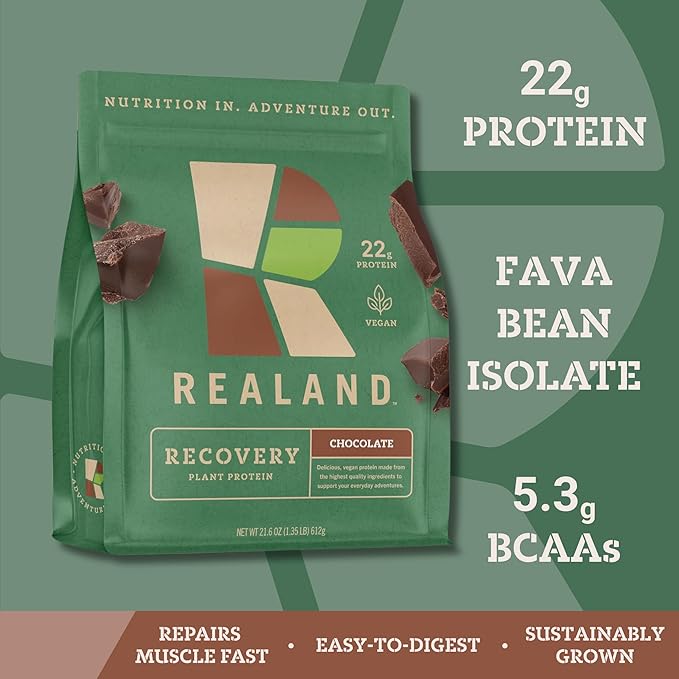 - REALAND RECOVERY PROTEIN: A revolutionary approach to plant-based recovery. Each serving packs a powerful 22 grams of protein, derived from fava bean protein isolate, known for its smooth texture and absence of the typical plant protein aftertaste. Enhanced with the rich flavor of organic cocoa, this vegan formula offers a deliciously clean and satisfying post-workout option.