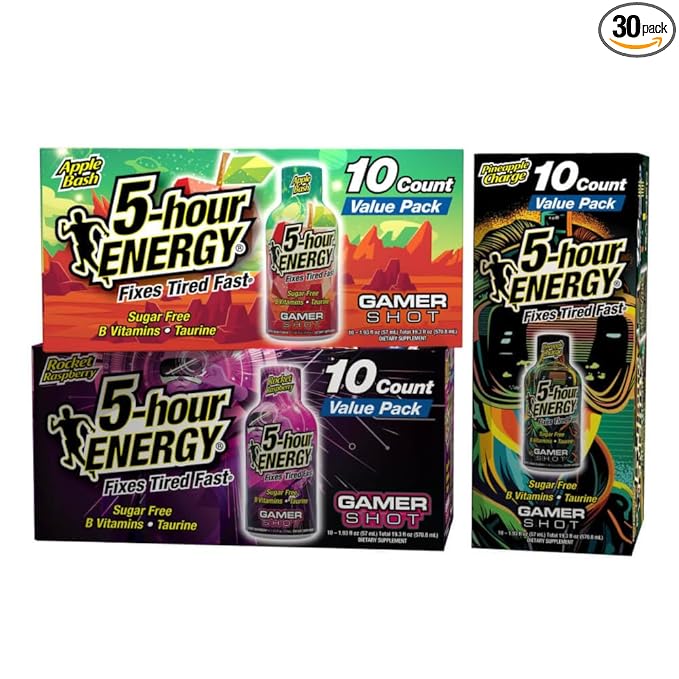 5-Hour Energy Gamer Shots Variety Pack, 30 Count (1.93 fl oz) - Extra Strength Apple Bash, Rocket Raspberry, Pineapple Charge Flavors