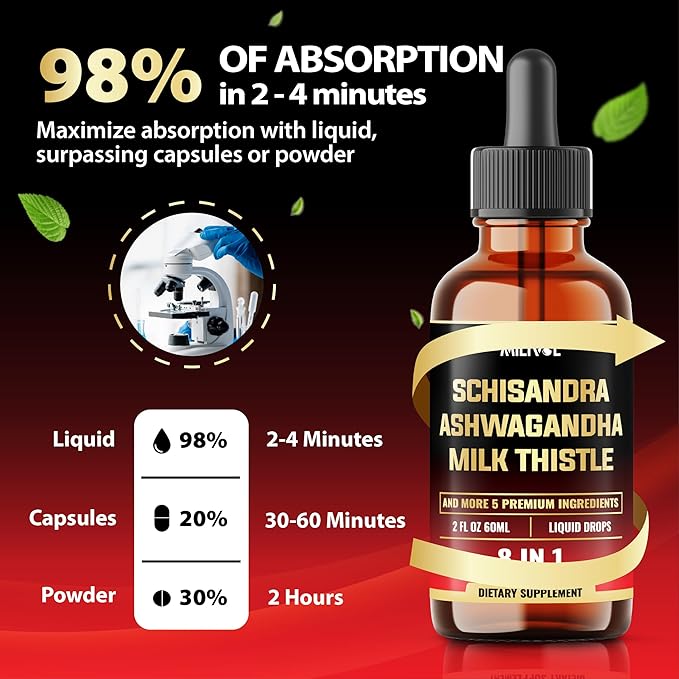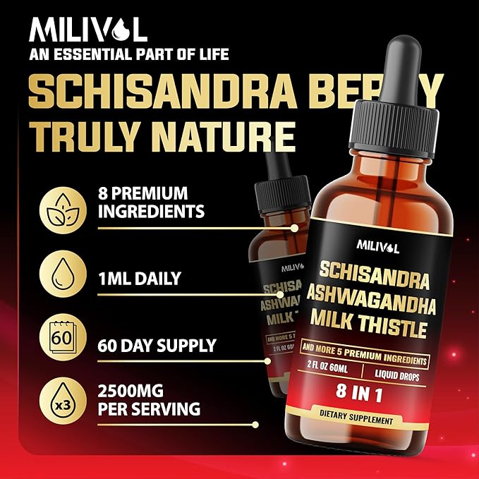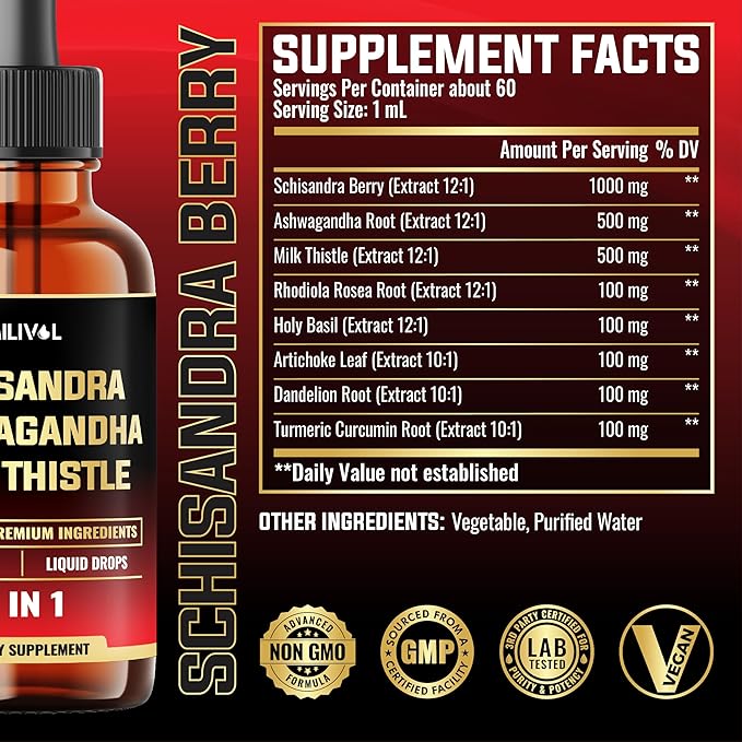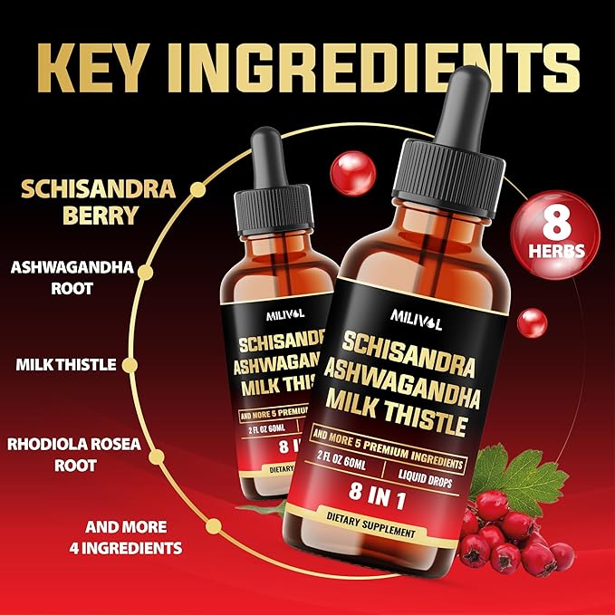 - ✔️ Herbal Ingredients: 8in1 Schisandra Liquid Drops combines Schisandra Extract, Ashwagandha Root, Milk Thistle Extract, Rhodiola Rosea Root, Holy Basil, Artichoke Leaf, Dandelion Root, and Turmeric Curcumin Root, creating a balanced blend to support well-being.