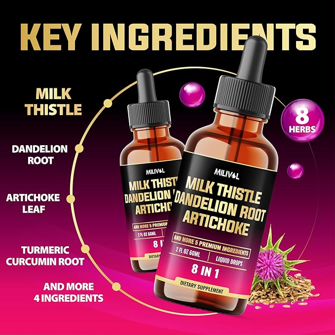 - ✔️ Highly Concentrated: 8in1 Milk Thistle Drops includes Milk Thistle, Dandelion Root, Artichoke Leaf, Turmeric Curcumin Root, Schisandra Berry, Chanca Piedra, Peppermint, and Beet Root.