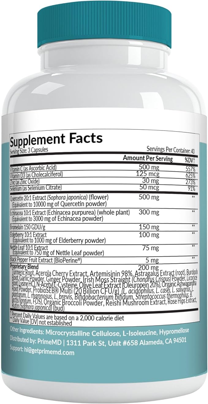 - What Are the Ingredients? - With a comprehensive 28-in-1 formulation, PrimeMD's immune defense supplement is enriched with key ingredients such as Quercetin Extract, Zinc, Vitamin D3, Elderberry Extract, Bromelain, Vitamin C, Echinacea Extract, Black Pepper, and a proprietary blend of herbal extracts.