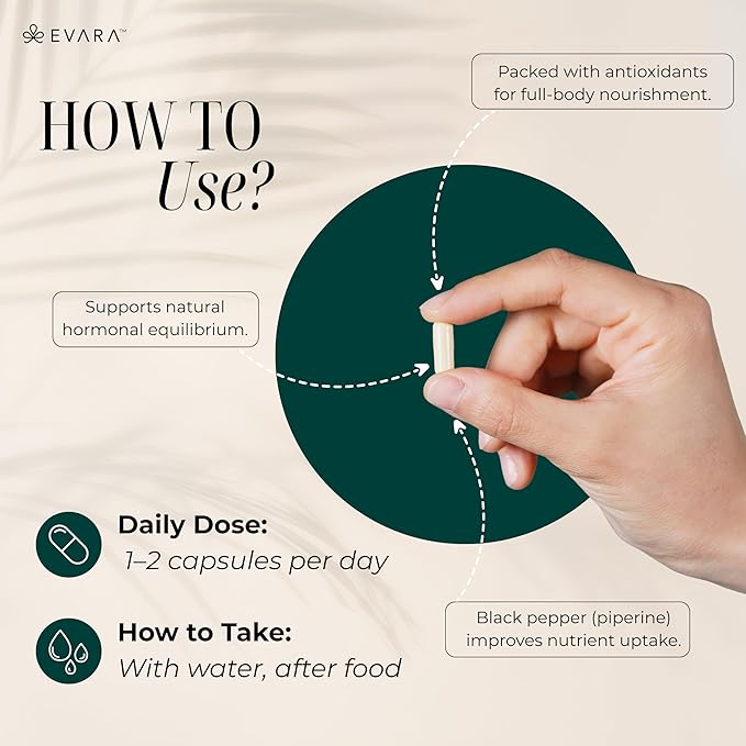 - SUGGESTED USE: As a dietary supplement, take 1 EVARA Ashwagandha vegetarian capsule twice daily with meals or as directed by your healthcare practitioner.