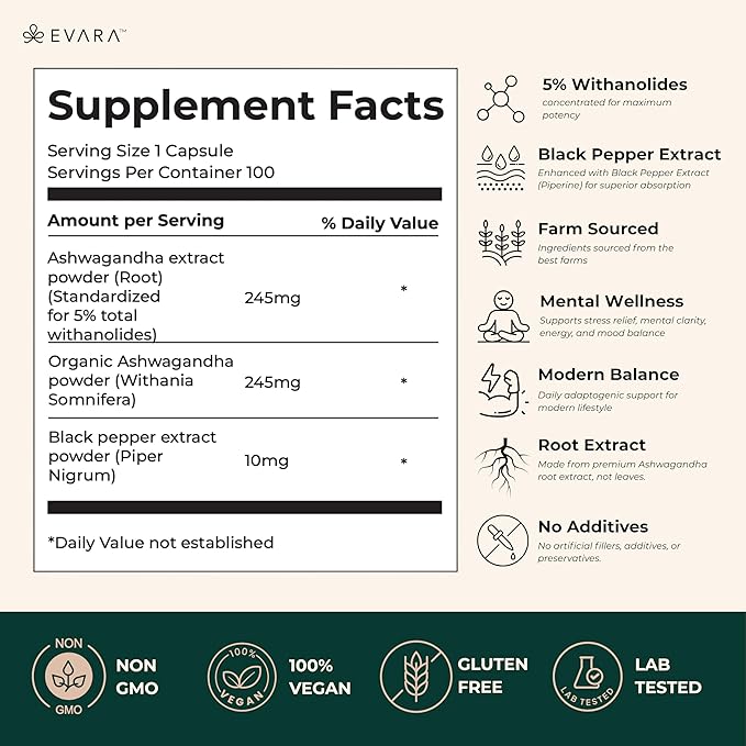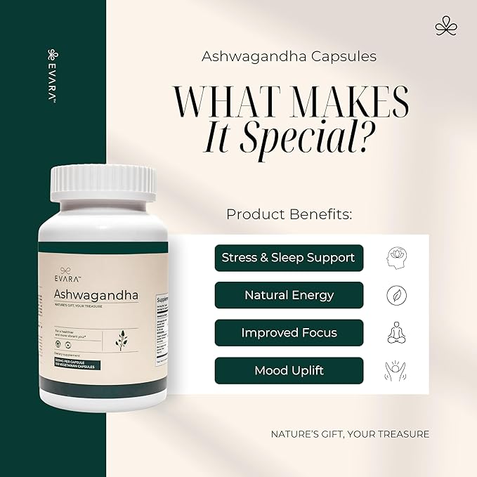 - OUR ASSURANCE: At EVARA, we promise the purest, nature-derived Ashwagandha. Our supplements are crafted with complete transparency. Each GMP-certified capsule harnesses the ancient power of Ashwagandha. With EVARA, you receive only the highest quality ingredients—no additives, just pure, potent Ashwagandha extract to enhance your well-being.