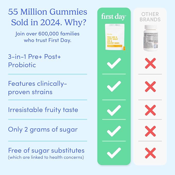 - Loved by Kids, Trusted by Parents: First Day gummies are delicious, made with natural flavors, and easy to add to your kid’s daily routine. Parents love that First Day has ZERO artificial sweeteners, only 2g of sugar, and is free of gelatin, making it easy for little teeth to chew.