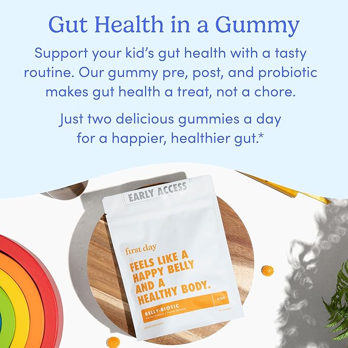 FIRST DAY Kids Probiotic Gummies - 3 in 1 Probiotics for Kids + Prebiotic & Postbiotic - Prebiotics & Probiotics for Digestive Health & Immune Support – Vegan, Gluten Free, 30-Day Supply