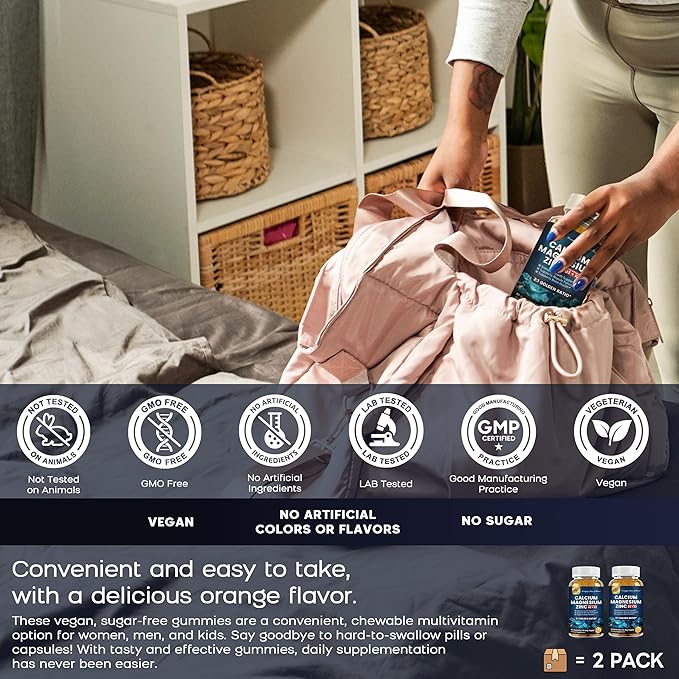 - 【Vegan, Sugar-Free, and Easy to Take】These vegan, sugar-free gummies are easy to chew and are suitable for women, men, and kids. Say goodbye to hard-to-swallow pills or capsules! The delicious blueberry-flavored, high-efficiency gummies make it easier to take your daily supplements (children aged 4-14 should take 1 gummy daily, and teens and adults are recommended to take 2 gummies daily, with a maximum of 2 gummies per day). Convenient for use at home or on the go, you'll never forget to take your calcium, magnesium, and zinc chewables again