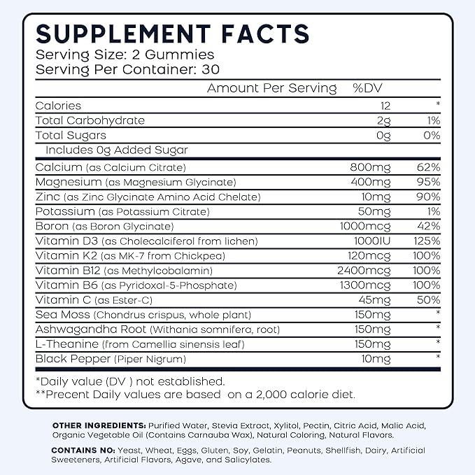 - 【All-in-One Formula】Why take multiple supplements when you can get everything you need from our single gummy? Additional potassium and boron support muscle function and bone health, organic sea moss extract provides extra trace minerals, Ashwagandha supports relaxation and emotional balance, L-thiamine promotes energy metabolism, and black pepper extract enhances overall absorption efficiency. Our professional 14-in-1 formula offers a comprehensive solution