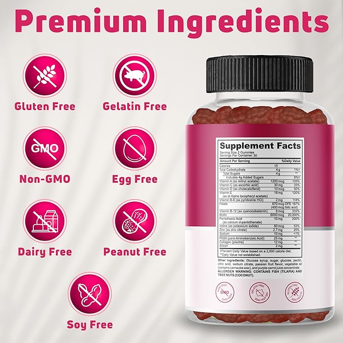 - SUPERCHARGED WITH COLLAGEN & PABA: Unlike other biotin gummies, ours go the extra mile. Collagen helps improve skin elasticity and smoothness, while PABA supports hair color and scalp health. Collagen and Biotin for hair growth for women and men.